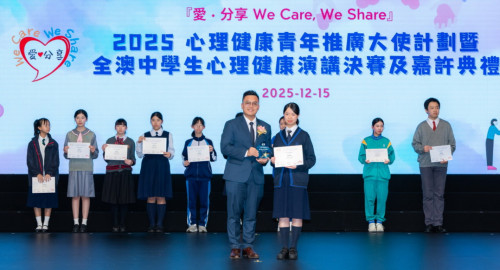 由教育及青年發展局、社會工作局及衛生局指導,澳門基金會資助,並由澳門演講家協會、澳門扶輪社及澳門基督教青年會聯合主辦的第三屆「愛.分享 We Care, We Share」心理健康青年推廣大使計劃暨全澳中學生心理健康演講比賽總決賽及嘉許典禮於2025年12月15日舉行,本校老師林世豪帶領本校同學參與。