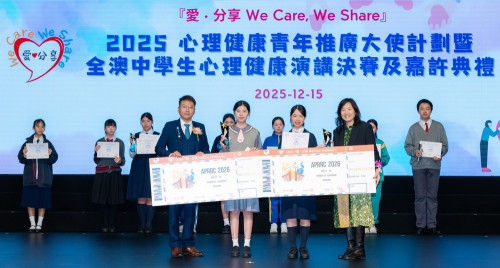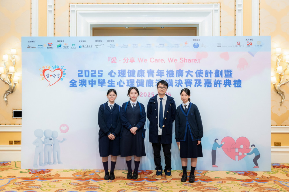 由教育及青年發展局、社會工作局及衛生局指導,澳門基金會資助,並由澳門演講家協會、澳門扶輪社及澳門基督教青年會聯合主辦的第三屆「愛.分享 We Care, We Share」心理健康青年推廣大使計劃暨全澳中學生心理健康演講比賽總決賽及嘉許典禮於2025年12月15日舉行,本校老師林世豪帶領本校同學參與。