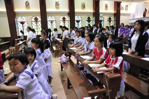 Catholic students, class representatives and all staff members attended the mass held in the chapel after the Celebration. The mass was filled with the beautiful songs rendered by our secondary choir and the grateful prayers led by the priest, sisters and all Catholic teachers and students. The mass ended with happiness at 12:00 pm.