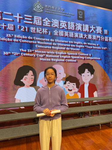 On November 9, our students demonstrated their exceptional speaking skills at the English Speech Contest, held by Macao Polytechnic University. We are proud to announce that Ivana Leong (F3P) earned the 3rd prize in the junior secondary category, demonstrating remarkable talent and confidence. Additionally, Venus Chu (P6C) received a merit award in the upper primary category, highlighting her dedication and hard work. Congratulations to our talented students for their outstanding achievements!